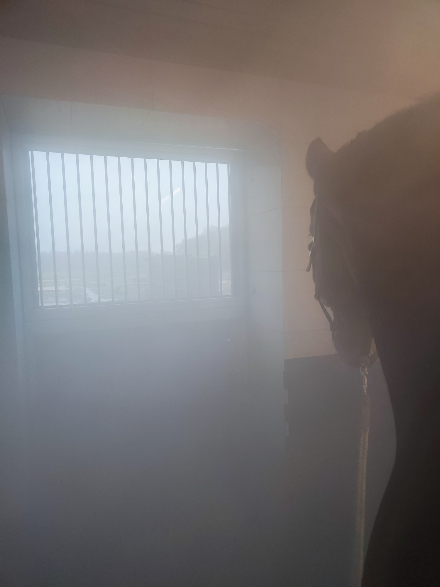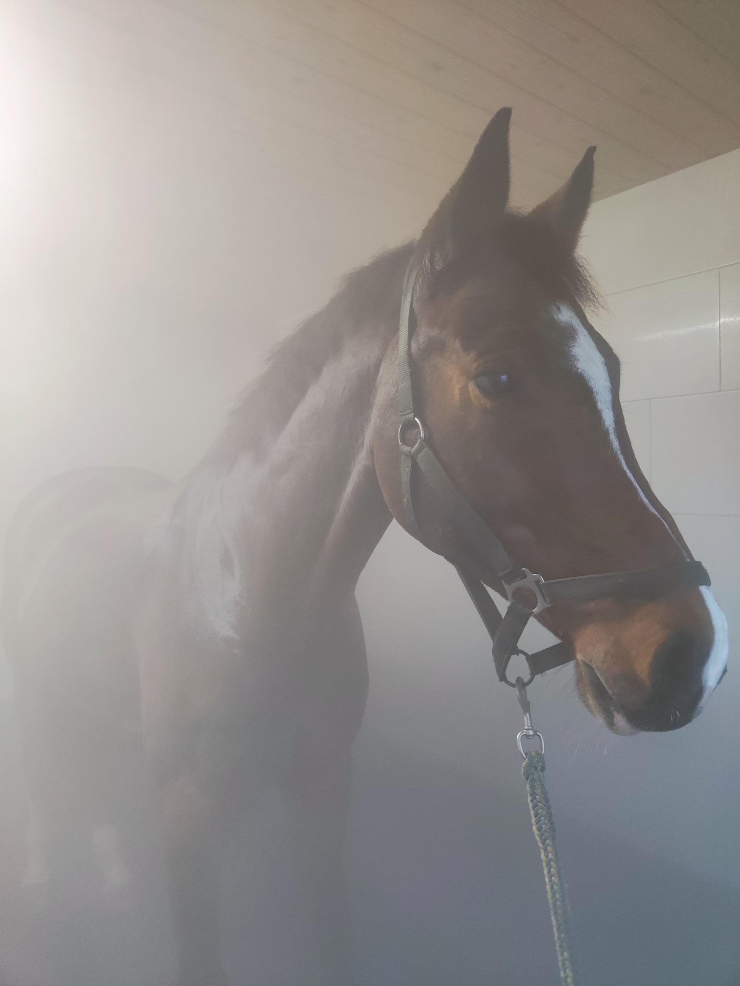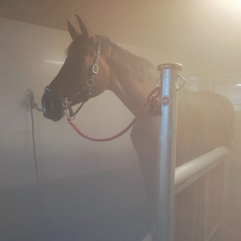 Unsere Solekammer ist ein geschlossener, komplett gefliester Raum, in dem feinster Salz-Aerosol-Nebel aus hochwertiger Solelösung in die Luft gebracht wird. Ihr Pferd atmet diesen sanften Nebel ein – die winzigen Salzpartikel gelangen tief in die Atemwege und können dort ihre wohltuende Wirkung entfalten.